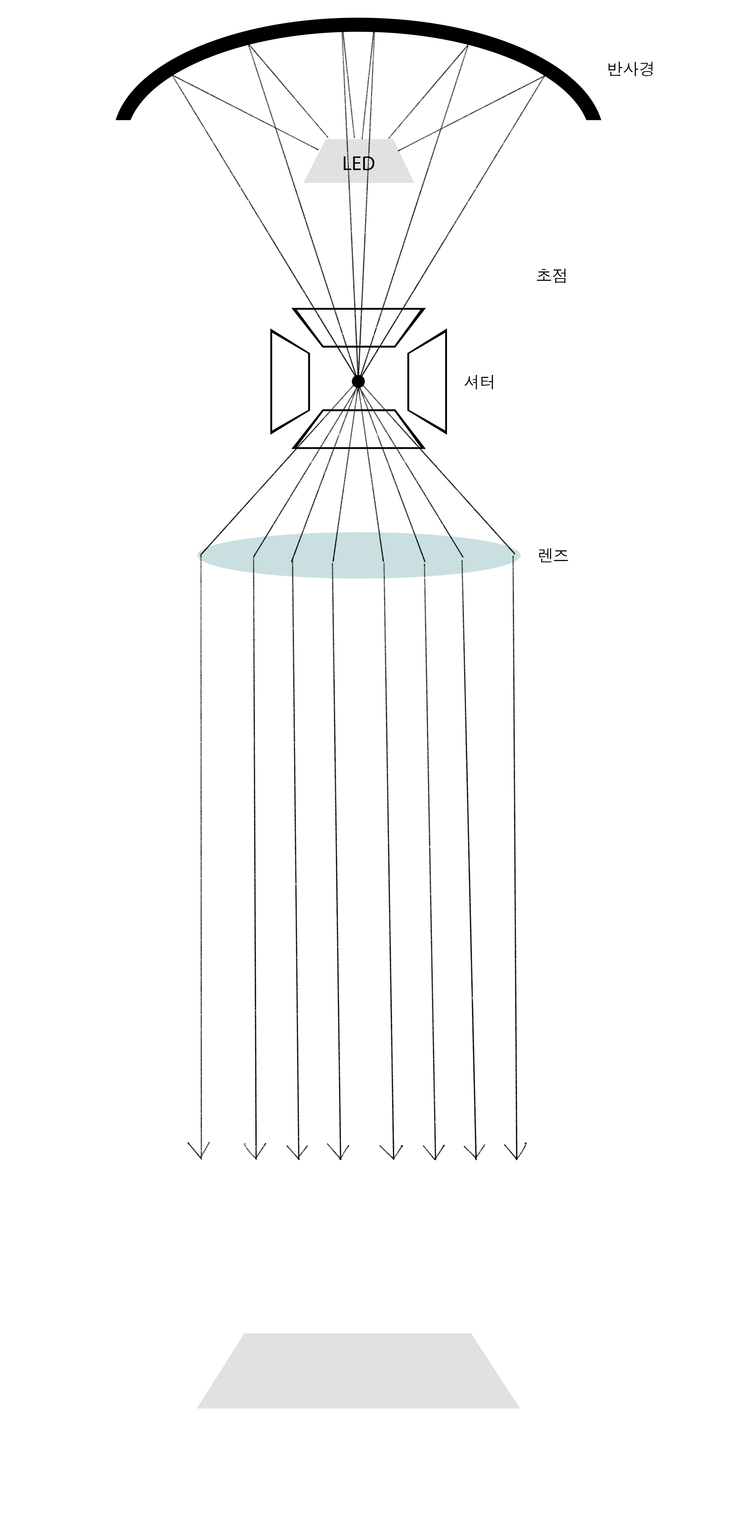 To create a distinct boundary of light in the air from the ceiling and to project a square-shaped area of light onto the floor of consistent intensity, various technical considerations and experiments are required. The first implementation plan involves creating a specific lighting device using reflectors and lenses. The layout is illustrated in the diagram below: